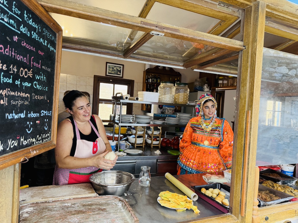 Tijdens een kookworkshop maakte ik mijn eigen bord ‘Makarounes‘ in Olympos. Een kookles in de keuken van Marina en Anna bij Taverna Olympos is onvergetelijk. Terwijl ik het meest traditionele gerecht aan het maken was, keek de dochter in klederdracht toen bij het open keukenraam.